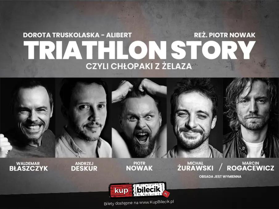 W hotelowym pokoju, wieczorem, przypadkowo spotykają się czterej uczestnicy zawodów triathlonowych. Każdy z nich zjawia się tam z innego powodu i każdy z nich czegoś innego oczekuje od startu. Łączy ich triathlon a co ich dzieli? Wszystko! Mają zupełnie odmienne poglądy na życie i odmienne życiowe doświadczenia, różne temperamenty i sprzeczne charaktery, nawet poczucie humoru każdy z nich ma inne. Wydawać by się mogło, że nigdy się ze sobą nie dogadają, jednak wymykające się spod kontroli absurdalne zdarzenia powodują, że pomiędzy bohaterami zawiązuje się prawdziwe męskie porozumienie, a może nawet rodzi się męska przyjaźń. "Triathlon story" rozbraja szczerością, uwodzi potężną dawką dobrego humoru i nie zwalnia tempa ani na chwilę. Bawi widzów od pierwszej do ostatniej minuty spektaklu. Nieoczekiwane zwroty akcji, brawurowe sytuacje i mistrzowska gra aktorska gwarantują doskonałą, pełną pozytywnych emocji rozrywkę.